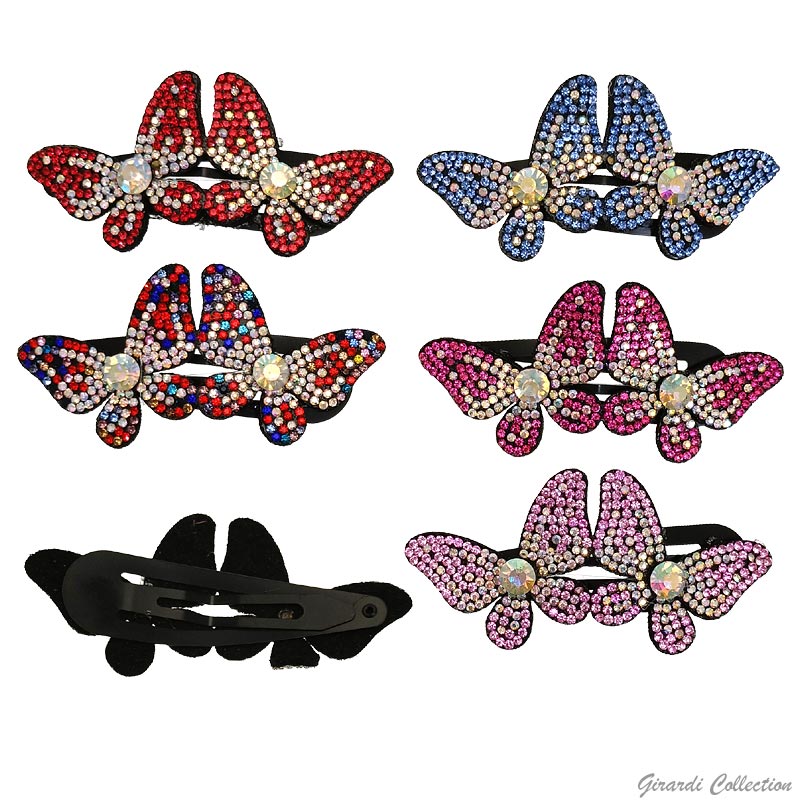Fermacapelli Clic Clac in metallo con 2 farfalle di strass colorati su panno nero.